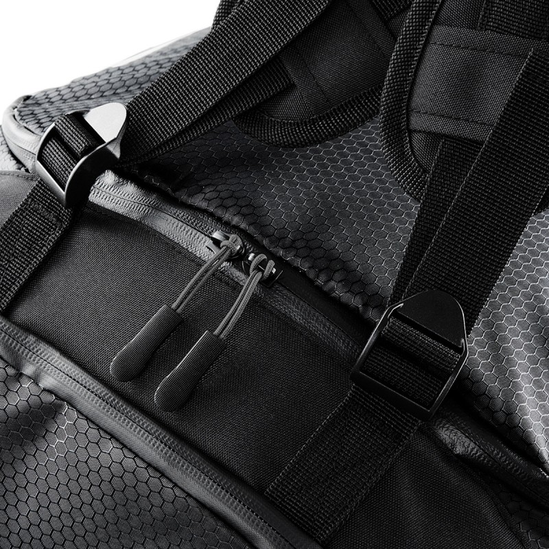 100% Combinazione poliestere 600d/600d a nido d'ape. Borsone con zip con cordini catarifrangenti, compartimento principale imbottito, compartimento per scarpe, base imbottita rinforzata. Dimensioni: 67 x 33 x 42 cm, capacita': 60 litri, area di stampa: 36 x 14 cm.